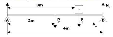 Uma prancha de comprimento 4m e de massa 2Kg está apoiada nos pontos A e B, conforme a figura. Um bloco de massa igual a 10Kg é colocado sobre a prancha à distância x = 1m da extremidade da direita e o sistema permanece em repouso. Nessas condições, o módulo da força que a prancha exerce sobre o apoio no ponto B é, em newtons,