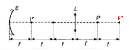 Uma lente convergente L de distância focal igual a f e um espelho esférico E com raio de curvatura igual a 2f estão dispostos coaxialmente, conforme mostra a figura abaixo.
