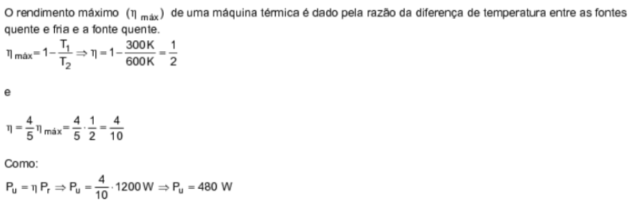 Uma máquina térmica, funcionando entre as temperaturas de 300K e 600K fornece uma pot~encial útil, Pu. a partir de uma potência recebida, Pr. O rendimento dessa áquina corresponde a 4/5 do rendimento máximo previsto pela máquina de Carnot, Sabendo que a potência recebida é de 1200 W, a potência útil, em watt, é