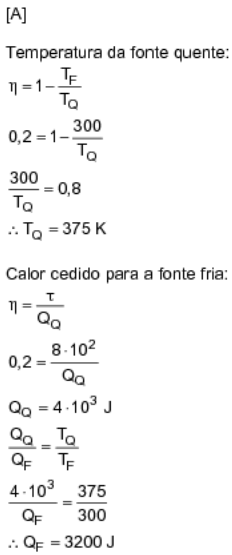 Uma máquina térmica realiza a cada ciclo um um trabalho de 8x102 J, com uma eficiência de 20%. Considerando que essa máquina opere segundo um ciclo de Carnot, com a fonte fria a uma temperatura de 300K, qual é a temperaura da fonte quente e quanto calor é cedido para a fonte fria, respectivamente?