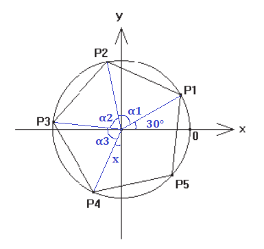Na figura, está representado um círculo trigonométrico em que os pontos P1 a P5 indicam extremidades de arcos. Esses pontos, unidos, correspondem aos vértices de um pentágono regular inscrito no círculo. Se o ponto P1 corresponde a um arco de radianos, então o ponto P4 corresponderá à extremidade de um arco cuja medida, em radianos, é igual a