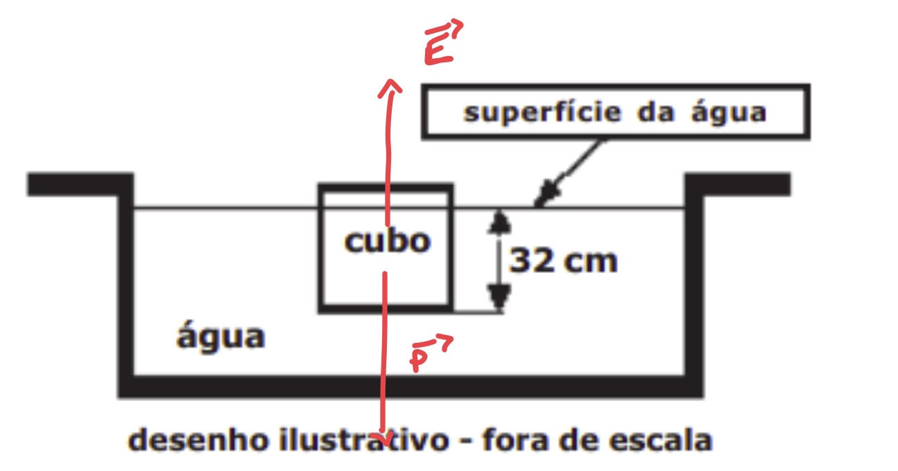 O volume cubo é calculado: , mas somente 32 cm da altura do cubo está submersa, assim: