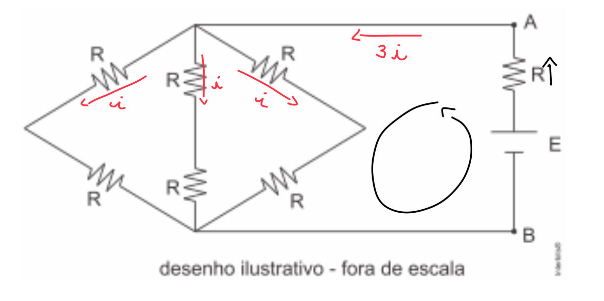 No circuito elétrico desenhado abaixo, todos os resistores ôhmicos são iguais e têm resistência R = 1,0 Ω. Ele é alimentado por uma fonte ideal de tensão contínua de E = 5,0 V. A diferença de potencial entre os pontos A e B é de: