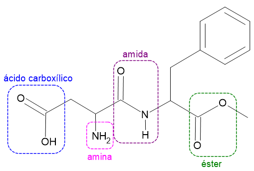 (EsPCEx - 2015) O composto denominado comercialmente por Aspartame é comumente utilizado como adoçante artificial, na sua versão enantiomérica denominada S, Saspartamo. A nomenclatura oficial do Aspartame especificada pela União Internacional de Química Pura e Aplicada (IUPAC) é ácido 3-amino-4-[(benzil-2-metóxi-2-oxoetil)amino]-4-oxobutanoico e sua estrutura química de função mista pode ser vista abaixo