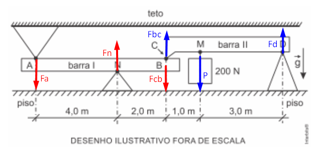No ponto M da barra II, é colocado um peso de 200 N suspenso por um cabo de massa desprezível. A barra I está apoiada no ponto N no vértice de um cone fixo no piso. O ponto A da barra I toca o vértice de um cone fixo no teto. O ponto B da barra I toca o ponto C, na extremidade da barra II. O ponto D, localizado na outra extremidade da barra II, está apoiado no vértice de um cone fixo no piso.
