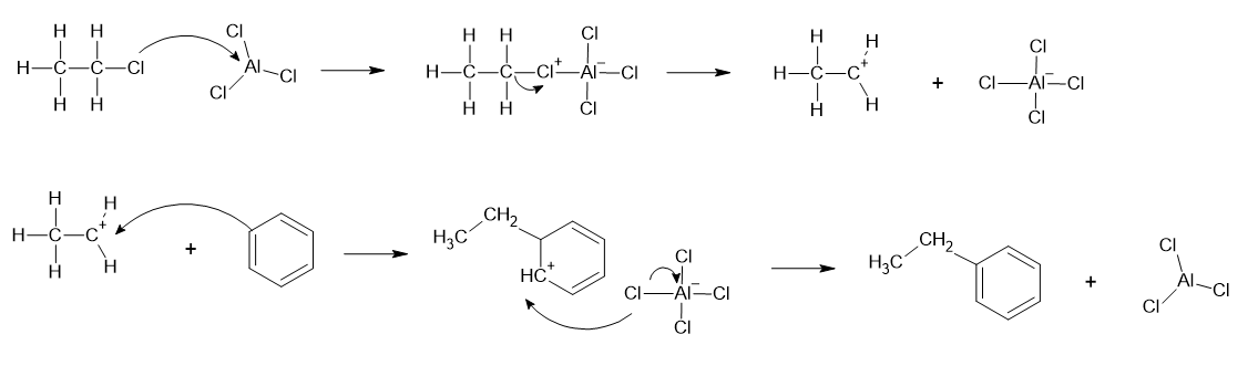Para obtenção de um haleto orgânico, na primeira etapa é feita uma reação de halogenação (substituição de hidrogênios de compostos orgânicos por átomos de haletos como o cloro, denominada de reação de cloração"). Em seguida, na segunda etapa, é feito um processo conhecido por reação de alquilação de Friedel-Crafts("reação de haletos orgânicos com compostos aromáticos ou, simplesmente, a ligação de grupos alquila a estrutura de compostos orgânicos como anéis aromáticos").