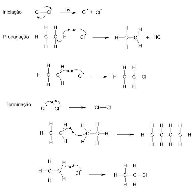 A primeira reação é a cloração, que é representada pelo mecanismo: