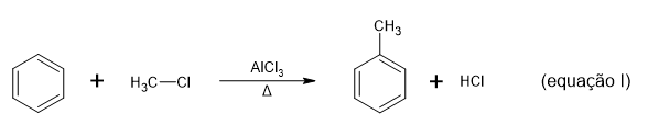 Na alquilação aromática, ocorre a ligação de grupos alquil (estrutura carbônica como os grupos -CH3) à estrutura de anéis aromáticos, pela substituição de um hidrogênio do anel. O catalisador mais comum nesse processo é o cloreto de alumínio (AICI3). A reação expressa na equação II é a mononitração de aromáticos e demonstra uma nitração, em que apenas um grupo nitro e adicionado à estrutura orgânica, pela substituição de um hidrogênio do anel. Usa o reagente ácido nítrico (HNO3) e o catalisador ácido sulfúrico (H2SO4).