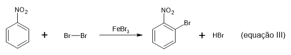 A reação expressa na equação III é a de haletos orgânicos com compostos aromáticos monossubstituídos e mostra outro processo químico denominado halogenação, no qual um átomo de halogênio é adicionado à estrutura orgânica, pela substituição de um hidrogênio do anel. Esse processo pode ser catalisado pelo FeBr3.