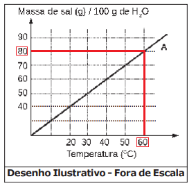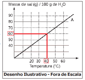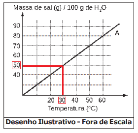 No gráfico apresentado tem-se a a curva de solubilidade de um sal A em água, em função da temperatura, em que a reta representa o coeficiente de solubilidade, ou seja, o máximo solubilizado nessa condição.