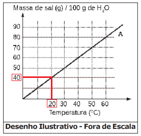 [I] Correta. Na temperatura de 20ºC, a quantidade máxima de sal solúvel em 100g de água é igual a 40 g, o que pode ser observado no gráfico a seguir:
