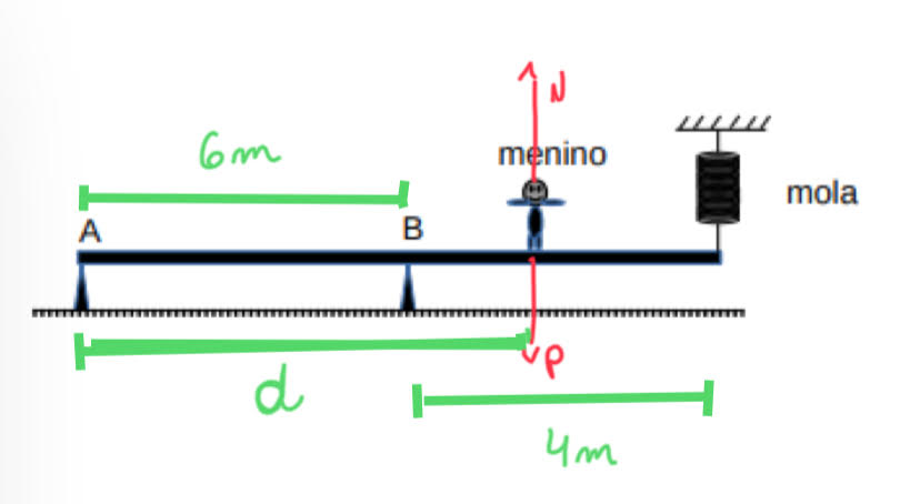 Uma barra plana de peso desprezível tem o comprimento de 10 m e está simplesmente apoiada em dois suportes, nos pontos A e B, que distam 6 m entre si e que a mantém na posição horizontal. Uma das suas extremidades está apoiada em A, e a outra está presa a uma mola ideal vertical fixa no teto de constante elástica igual a 25 N/m, conforme representado no desenho abaixo. Um menino de peso 400 N caminha sobre a barra a partir do ponto B em direção à extremidade presa à mola. Quando o menino está à máxima distância D do ponto A, sem que a barra gire, a elongação da mola é de 40 cm. O valor da máxima distância D é