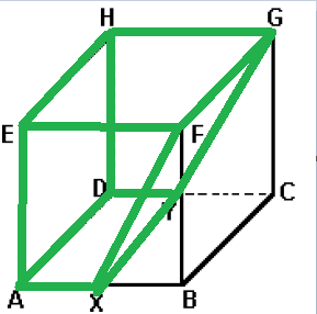 (Fuvest - 1995) Na figura a seguir, X e Y são, respectivamente, os pontos médios das arestas AB e CD do cubo. A razão entre o volume do prisma AXFEDYGH e o do cubo é: