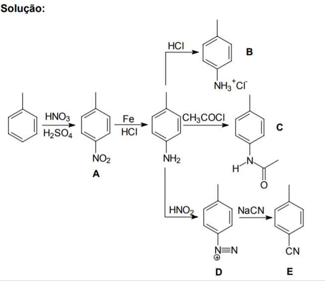 Determine, na sequência de reações abaixo, os principais produtos (A,B,C,D e E) em cada caso.