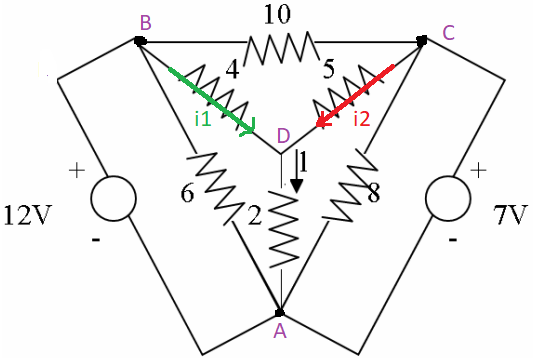 Os nós A, B, C e D foram estão indicados na figura abaixo, bem como as correntes i1 e i2 que atravessam os resistores.