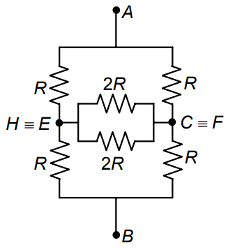Note que trata-se de uma ponte de Wheatstone equilibrada. Por isso, a resistência central pode ser ignorada. Então a resistência equivalente é: