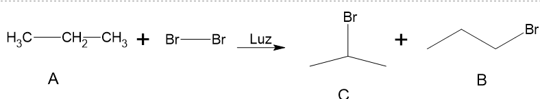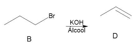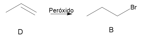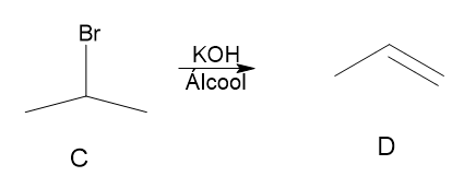 (IME - 2008/2009) A reação de um composto A (em excesso) com gás bromo sob luz ultravioleta gera principalmente os compostos B e C. A reação de B e C com KOH em solução alcoólica gera D, o qual reage com HBr, na presença de peróxidos, formando novamente o composto B. Este último é uma substância orgânica acíclica e saturada, cuja análise elementar revela a presença apenas de átomos de carbono, hidrogênio e bromo.