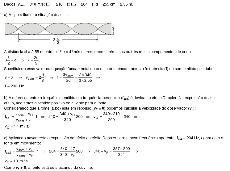(IME - 2009/2010) Dois vagões estão posicionados sobre um trilho retilíneo, equidistantes de um ponto de referência sobre o trilho. No primeiro vagão existe um tubo sonoro aberto onde se forma uma onda estacionária com 4 nós, cuja distância entre o primeiro e o último nó é 255 cm, enquanto no segundo vagão existe um observador. Inicialmente, apenas o vagão do observador se move e com velocidade constante. Posteriormente, o vagão do tubo sonoro também passa a se mover com velocidade constante, distinta da velocidade do vagão do observador. Sabendo que a frequência percebida pelo observador na situação inicial é 210 Hz e na situação posterior é 204 Hz, determine: