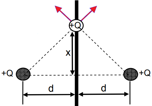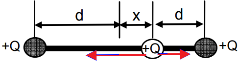 a) verificar, justificando, se haverá movimento oscilatório em torno do ponto de equilíbrio; b) calcular o período de oscilação para pequenas amplitudes se comparadas com a distância d, em caso de haver movimento oscilatório.