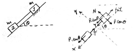 \x_{1}\x_{2}\y_{1}   left{egin{matrix} P_{1} cdot sen	heta + T - f_{at}=m cdot a Rightarrow P_{1} cdot sen	heta +T- N cdot frac{mu}{2}=m cdot a&[I]\ P_{2} cdot sen	heta - T=2m cdot a Rightarrow P_{2} cdot sen	heta -2ma&[II] \P_{1} cdot cos	heta = N&[III] end{matrix}