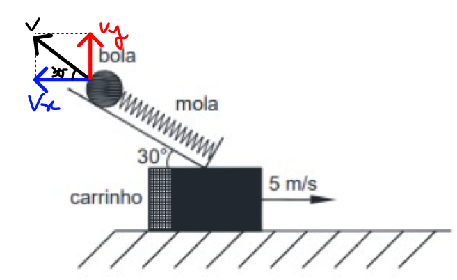 A figura apresenta um carrinho que se desloca a uma velocidade constante de 5 m/s para a direita em relação a um observador que está no solo. Sobre o carrinho encontra-se um conjunto formado por um plano inclinado de 30°, uma mola comprimida inicialmente de 10 cm e uma pequena bola apoiada em sua extremidade. A bola é liberada e se desprende do conjunto na posição em que a mola deixa de ser comprimida. Considerando que a mola permaneça não comprimida após a liberação da bola, devido a um dispositivo mecânico, determine: