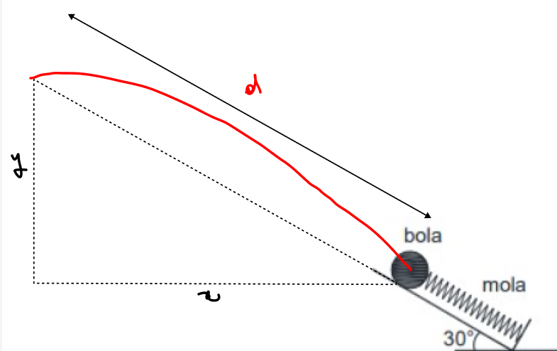 b) a distância entre a bola e a extremidade da mola quando a bola atinge a altura máxima.
