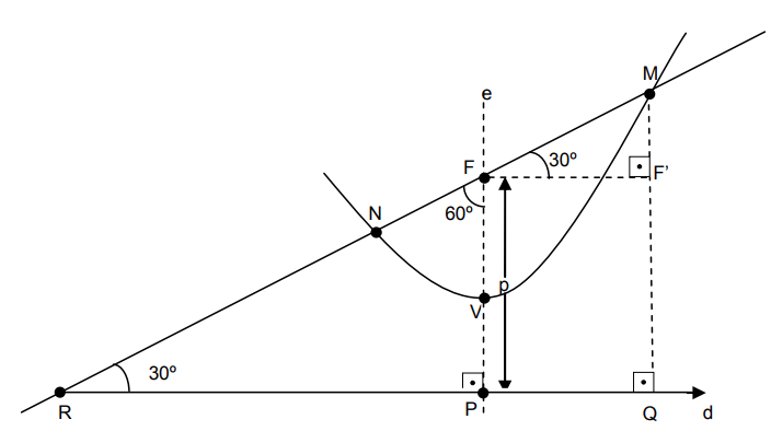 É dada uma parábola de parâmetro p. Traça-se a corda focal MN, que possui uma inclinação de 60º em relação ao eixo de simetria da parábola. A projeção do ponto M sobre a diretriz é o ponto Q, e o prolongamento da corda MN intercepta a diretriz no ponto R. Determine o perímetro do triângulo MQR em função de p, sabendo que N encontra-se no interior do segmento MR.