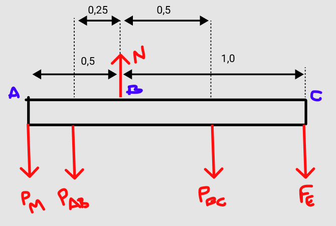 • massa específica linear do segmento BC da barra: 1,5 g/cm; • segmento AB barra: 50 cm;
