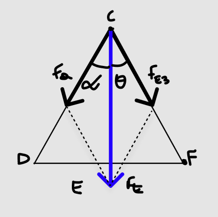 O primeiro passo é achar as distâncias CD e CE. Abaixo, temos uma figura esquematizando dois triângulos, onde CD é a altura relativa a G1 e G2. Assim, CD = 1cm. Sabendo CD, é possivel calcular a distância entre Q e o plano que contém as três outras cargas. Como o triângulo CED é pitagórico e DE = 0,6 cm, temos CE = 0,8 cm. Da figura, é possível concluir que por Pitágoras: