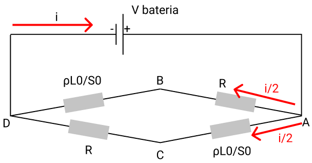 Como as resistências da associação em paralelo (entre A e D) são iguais em ambos os fios, então a corrente, ao passar pelo nó em A, se "divide em 2" idênticas (i/2).