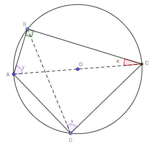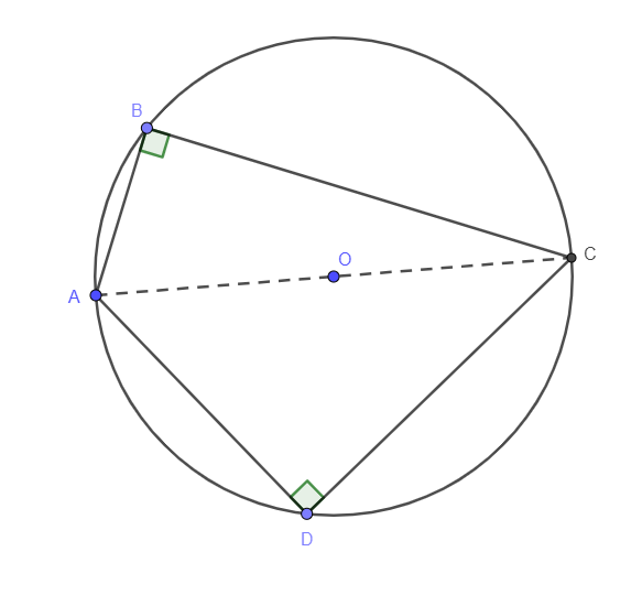 Como os ângulos ABC e CDA são ângulos retos, podemos inscrever o quadrilátero em uma circunferência, sendo o segmento AC o diâmetro da mesma. Dessa forma, temos a seguinte figura: