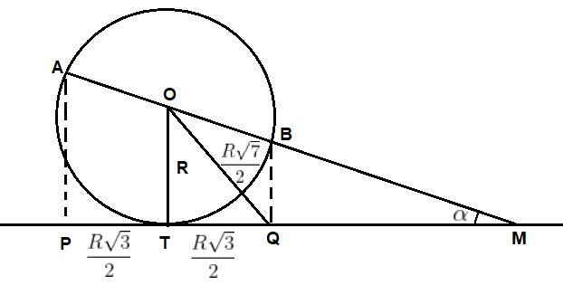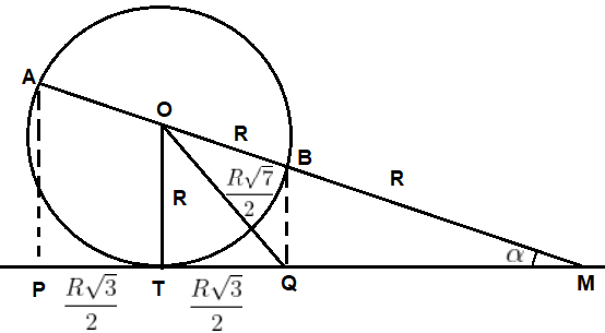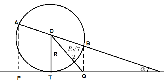 [IME - 2013/2014 - 1a fase] Sejam uma circunferência C com centro O e raio R, e uma reta r tangente a C no ponto T. Traça-se o diâmetro AB oblíquo a r. A projeção de AB sobre r é o segmento PQ. Sabendo que a razão entre OQ e o raio R é √7/2 , o ângulo, em radianos, entre AB e PQ é