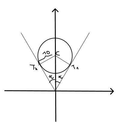Note que os números complexos dentro dessa região e que possuem menor e maior argumentos são aqueles que também estão sobre as retas tangentes À circunferência que passam pela origem. Os pontos de tangência foram designados com a letra T:
