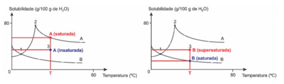 a) Incorreto. No ponto 1, as soluções A e B apresentam a mesma temperatura e as mesmas solubilidades.