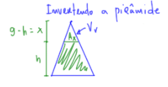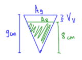 Um copo exótico de vidro, em uma festa, era uma pirâmide invertida de base pentagonal regula de 9 cm de altura. Esse copo continha uma bebida que ocupava 8 cm de altura. Um dos convidados fechou a base pentagonal do copo e o virou de cabeça para baixo. A nova altura h da bebida, em cm, em relação à base pentagonal satisfaz: