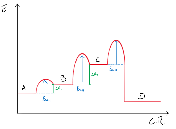 Trace a curva referente à energia potencial em função do caminho da reação A → D, admitindo que a reação global A → D seja exotérmica e considerando que: ΔHII > ΔHI > 0 ; EaI < EaIII.