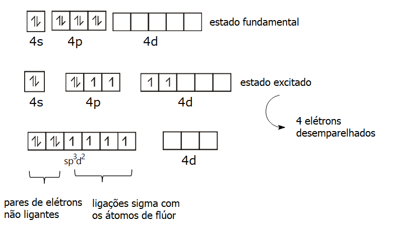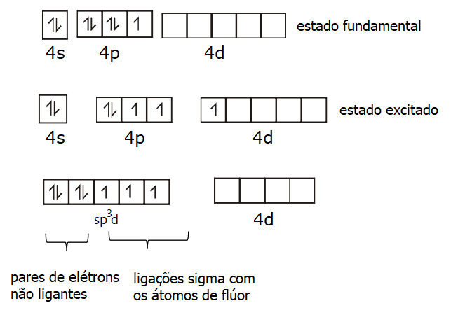 Considere as seguintes espécies no estado gasoso: BF3, SnF3-, BrF3, KrF4, BrF5. Para cada uma delas, qual é a hibridização do átomo central e qual o nome da geometria molecular?