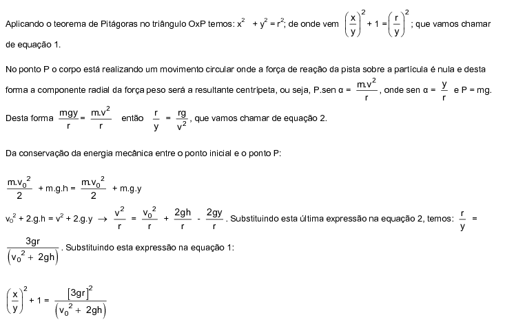 Um corpo de massa m e velocidade v0 a uma altura h desliza sem atrito sobre uma pista que termina em forma de semi-circunferência de raio r, conforme indicado na figura. Determine a razão entre as coordenadas x e y do ponto P na semi-circunferência, onde o corpo perde o contato com a pista. Considere a aceleração da gravidade g.