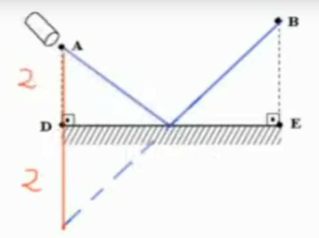 Um raio de luz de uma lanterna acesa em A ilumina o ponto B, ao ser refletido por um espelho horizontal sobre a semi-reta DE da figura, estando todos os pontos num mesmo plano vertical. Determine a distância entre a imagem virtual da lanterna A e o ponto B. Considere AD = 2 m, BE = 3 m e DE = 5 m.