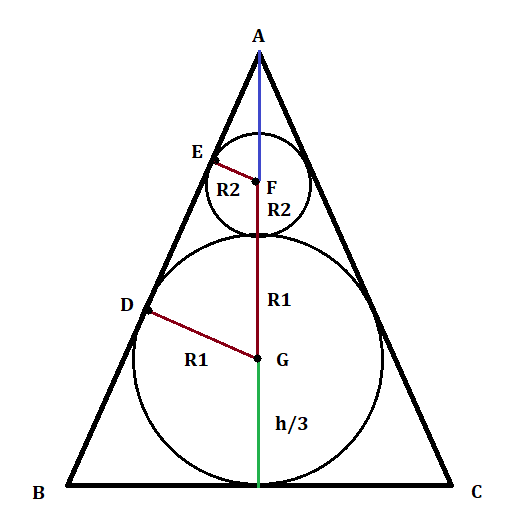 Seja C1 uma circunferência de raio R1 inscrita num triângulo equilátero de altura h. Seja C2 uma segunda circunferência, de raio R2, que tangencia dois lados do triângulo internamente e C1 externamente. Calcule (R1 − R2)/h.