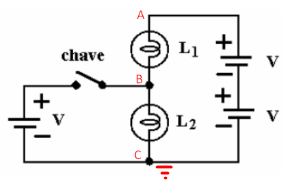 Antes de fechar a chave temos o circuito apenas com a malha da direita, então há uma queda de tensão de 2V entre as duas lâmpadas. Como são Lâmpadas iguais cada uma então está submetida a uma diferença de potencial V, então podemos entender que o potencial C é 0(Terra), o potencial de B é V e o potencial de A é 2V.
