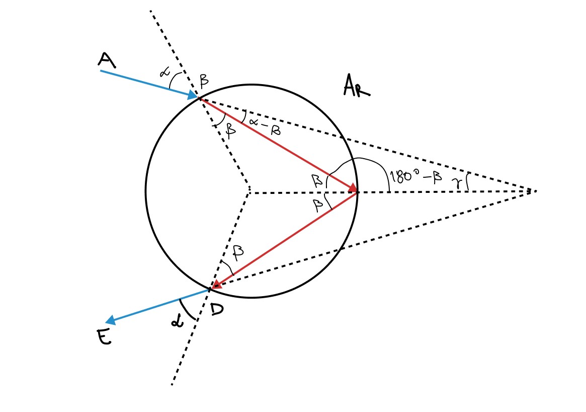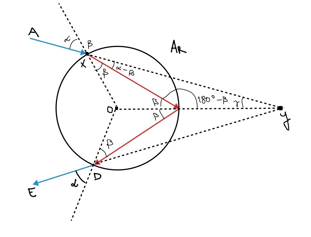 Ele então apresentou a figura onde estão representadas as trajetórias para os arco-íris primário e secundário. Determinar o ângulo entre o raio incidente na gota, AB, e o incidente no olho do observador, DE, no caso do arco-íris primário, em termos do ângulo de incidência, e do índice de refração da água na . Considere o índice de refração do ar n = 1.