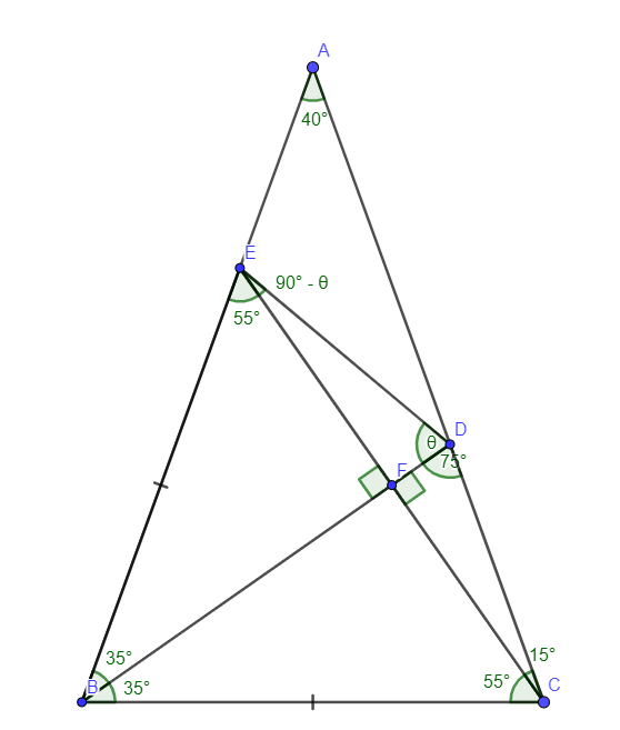 (ITA - 2008 - 1a Fase) Considere o triângulo ABC isósceles em que o ângulo distinto dos demais, , mede 40º. Sobre o lado