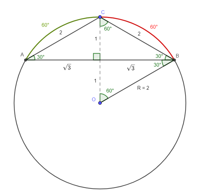 Do triângulo de vértices A, B e C, inscrito em uma circunferência de raio R = 2 cm, sabe-se que o lado mede 2 cm e o ângulo interno