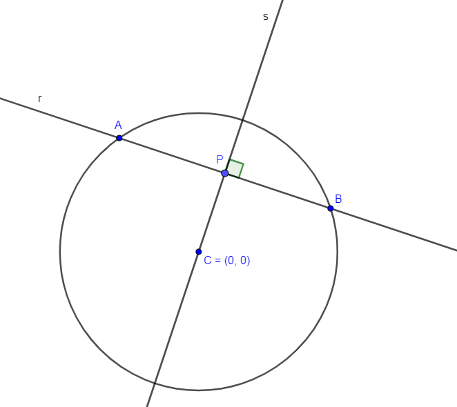 Seja P (1,3) o ponto médio da corda AB, r a reta que passa pelos pontos A, B e P e s a reta perpendicular r que passa por P e pelo centro da circunferência, temos a seguinte figura:
