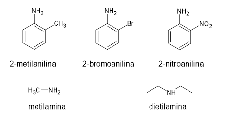 Comparando os compostos C, D e E, todos possuem um grupo ligado ao anel na posição orto em relação ao grupo amino. O -Br e o -NO2 são grupos retiradores de elétrons e o -CH3 é grupo doador de elétrons. O efeito retirador de elétrons do grupo nitro é mais forte do que o do -Br. Analogamente ao raciocínio anterior, o grupo doador de elétrons faz com que o par de elétrons do grupo amino esteja mais disponível para reagir como base. Portanto, a 2-metilanilina é mais básica que a 2-bromoanilina que é mais básica 2-nitroanilina.
