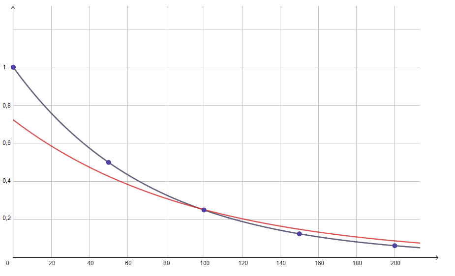 Considere duas reações químicas (I e II) envolvendo um reagente X. A primeira (I) é de primeira ordem em relação a X e tem tempo de meia-vida igual a 50 s. A segunda (II) é de segunda ordem em relação a X e tem tempo de meia-vida igual à metade da primeira reação. Considere que a concentração inicial de X nas duas reações é igual a 1,00 mol L-1. Em um gráfico de concentração de X (mol L-1) versus tempo (de 0 até 200 s), em escala, trace as curvas de consumo de X para as duas reações. Indique com I a curva que representa a reação de primeira ordem e, com II, a que representa a reação de segunda ordem.