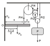 Uma barra homogênea, articulada no pino O, é mantida na posição horizontal por um fio fixado a uma distância x de O. Como mostra a figura, o fio passa por um conjunto de três polias que também sustentam um bloco de peso P. Desprezando efeitos de atrito e o peso das polias, determine a força de ação do pino O sobre a barra.