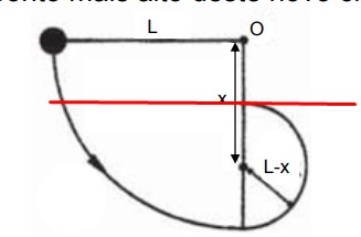 Um pêndulo, composto de uma massa M fixada na extremidade de um fio inextensível de comprimento L, é solto de uma posição horizontal. Em dado momento do movimento circular, o fio é interceptado por uma barra metálica de diâmetro desprezível, que se encontra a uma distância x na vertical abaixo do ponto O. Em consequência, a massa M passa a se movimentar num círculo de raio L − x, conforme mostra a figura. Determine a faixa de valores de x para os quais a massa do pêndulo alcance o ponto mais alto deste novo círculo.