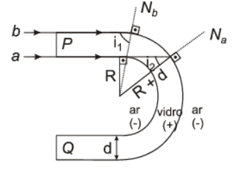 Para que toda a luz incidente na superfície P sofra emergência pela superfície Q é necessário que todos os raios do feixe sofram reflexão total ao incidir na superfície côncava de maior raio.